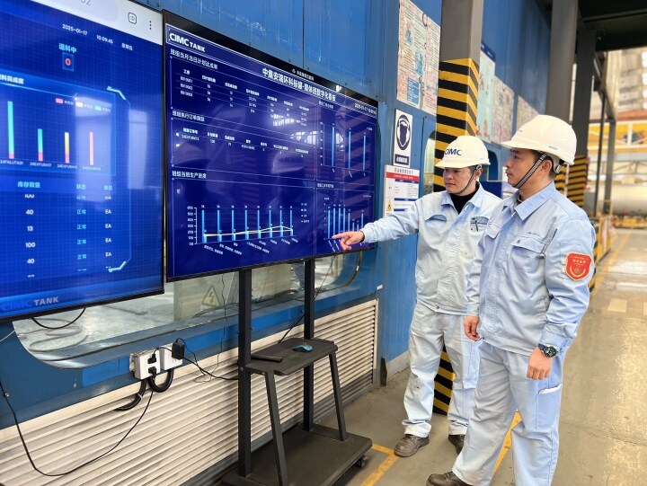 中集環(huán)科標罐車間內,生產執(zhí)行系統(tǒng)(MES)的使用,讓管理者更加精準把控生產進度節(jié)點;去年投入運營的噴粉車間,較以往用工減少了60%以上、生產效率提高了40%以上,工作人員通過中控室的數(shù)字大屏,可隨時了解車間生產運營、產量進度以及能耗管控等情況……